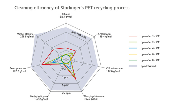 The results demonstrated that the system has excellent cleansing efficiency so that it is possible to use up to 100 % rPET produced on Starlinger recycling machinery for packaging with direct food contact.