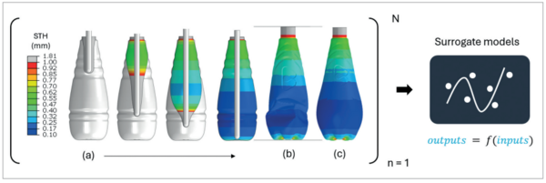 For example, in a recent case study, BMT optimised a 20.7 g recycled PET (rPET) preform for a BMT bottle design. By leveraging simulation data, a surrogate model was developed to predict mass distribution, top load, and burst pressure (Figure 1). These predictions were based on inputs such as preform geometry, temperature heating profiles, and blowing process conditions. The model demonstrated high predictive accuracy with R2 scores up to 0.95. This level of precision allows engineers to quickly evaluate design options, streamline decisionmaking, and minimise computational costs.