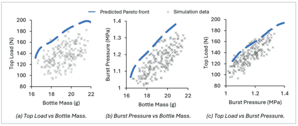 The next phase involves multi-objective optimisation using an evolutionary algorithm to identify the optimal balance between weight reduction and performance. This approach uncovers the tradeoffs between key factors, enabling near-instant selection of designs that offer the best compromise. For instance, in the recent case study, the aim was to reduce the preform weight while maintaining a minimum top load of 150 N and a burst pressure of 1.20 MPa. By analysing the Pareto front, a visual representation of the trade-offs, BMT was able to select designs that met these requirements while achieving significant material savings (Figure 2).