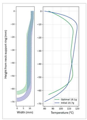 At scale, this translates into significant benefits. For an annual production rate of 25 million bottles, the optimised design eliminates over 65 tonnes of plastic per year, which is equivalent to five fully loaded double-decker buses. And the savings don’t stop at material usage. The lightweight design also required a 5 °C reduction in peak heating temperature (Figure 3), reducing energy consumption during manufacturing and contributing to a lower carbon footprint—an increasingly important metric in today’s climate-conscious economy.
