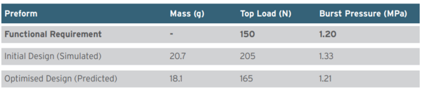The impact of BMT’s methodology is clear (Table 1). In the case study shown, the optimised preform weighed just 18.1 g, a 13% reduction from the original 20.7 g design. Despite the weight reduction, the preform maintained a top load of 165 N and a burst pressure of 1.21 MPa, meeting all performance requirements.
