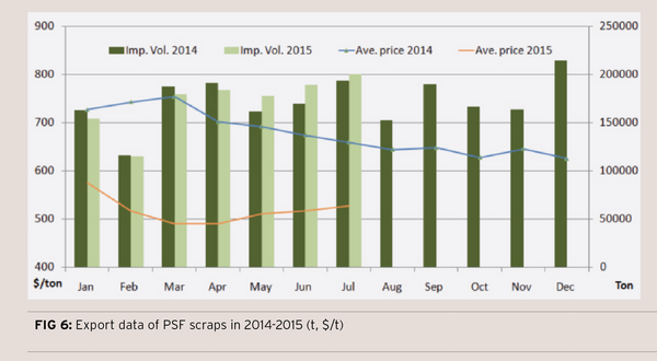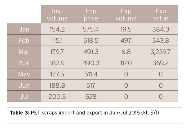 From January to July in 2015, the cumulative import volume of PET scraps ascends by 16.4 kt on a year-on-year basis, while the average import price drops by $187/ton.