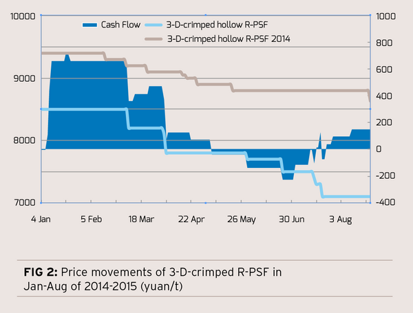 The following chart illustrates the movement of 3-D-crimped R-PSF market. From the chart, it can be seen that the market saw the price peak at the beginning of 2015, and then it went straight downwards, presenting an obvious downslide compared with the same period of 2014, with the gap generally at close to 1,000 yuan/ton, which showed signs to widen to 2,000 yuan/ton in recent days. As for profit margin, it was rich in the first half of 2015. It fell into the negative territory from May when the dull season came, while it recovered from July.