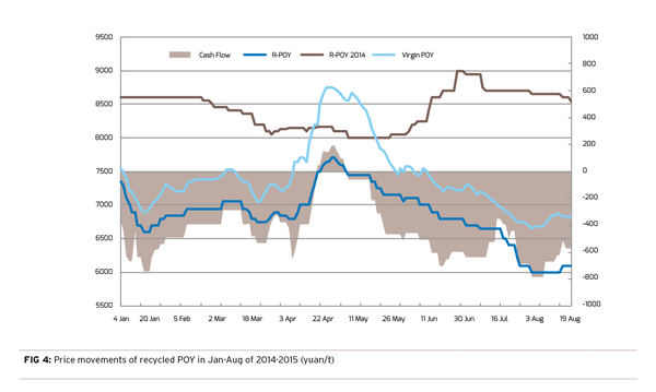 Next is the movement of recycled POY market, which was long-time in deficit. Its movement is highly related with virgin POY market. And compared with the same period of 2014, the price gap only narrowed in April when the broader polyester fiber market rose, while generally it stayed at 1,000-2,000 yuan/ton most of the time during the period.