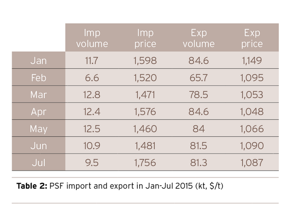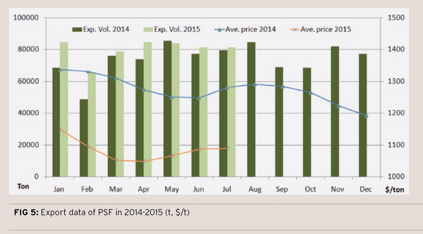 PSF export is mainly for R-PSF. From January to July in 2015, the cumulative export volume of PSF increases by 50.7 kt on a year-on-year basis, while the average export price falls by $203/ton.