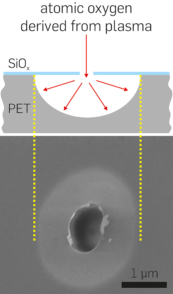 FIG 5: Each barrier layer (blue) contains small defects which, however, are invisible – a problem for quality analysis. The researchers’ trick: they use the barrier layer as mask and etch the underlying synthetic layer (PET) through the defects. Thus, larger holes are created that can be detected under the electron microscope © RUBIN, photo: Gorczany