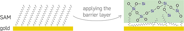 FIG 2: The oxygenic plasma process for depositing the silicon dioxide barrier layer (green) damages the synthetic surface. The RUB team demonstrated this using a self-assembled monolayer (SAM) which becomes disordered due to the deposit. © RUBIN, photo: Gorczany
