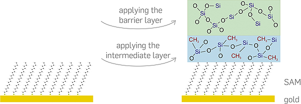 FIG 3: If the RUB team applies an intermediate layer (blue) prior to applying the barrier layer (green) to the synthetic surface, the surface remains intact. In the experiment, the group substituted a self-assembled monolayer (SAM) for the synthetic surface. © RUBIN, photo: Gorczany