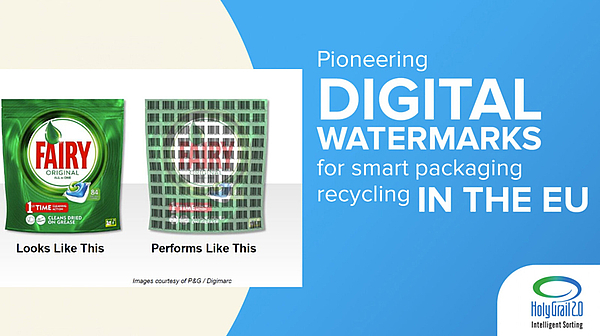 Digital watermarks are imperceptible codes, the size of a postage stamp, covering the surface of a consumer goods packaging and carrying a wide range of attributes. The aim is that once the packaging has entered into a waste sorting facility, the digital watermark can be detected and decoded by a standard high resolution camera on the sorting line, which then – based on the transferred attributes (for example food vs. non-food) – is able to sort the packaging in corresponding streams.