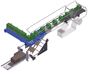 The packer is equipped with a perpendicular infeed, L-shaped compared to the product movement direction on the worktable, that ensures a smooth and continuous packaging, even in case of containers with a particular shape or with a great movement instability; this solution ensures the optimum flow of the loose product channeled that arrives from the production line, in order to create the selected pack configuration without hitches or interruptions.