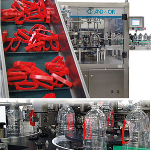 Handle applicator SIAL6000 performs the insertion of(PP) lateral handles on PET bottles (from 2 up to 5 liters).The machine is based on a rotary continuous system andit is appropriate to be installed in the existing packagingline, on an existing conveyor and before the filling process.It allows to do the insertion of the lateral handle at speedsup to 15.000 bph.It takes advantage of PET technology vs HDPE. It alsoavoids to insert the lateral handle within the blowmoulding machine, which increase the possibilitiesto have problems in the blow moulding machine anddecrease the efficiency of the line. Moreover, by insertingthe handle outside the mould, in the packaging line, thespeeds achieved can be much higher, up to 15.000 bph.For end users consumers, pouring the liquid from a bottlewith lateral handle is much easier.