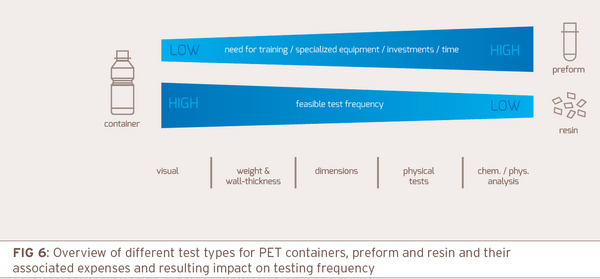 One observation that can be made is that most of the testing relates to the PET containers and only a smaller portion is covering preform and resin quality aspects. Also, while some tests are not connected to significant investments and operator training, others may require specialized equipment, time, repeat measurements to increase accuracy, operator expertise and the availability as well as proper handling and storage of chemicals. As a result, testing frequency is influenced (Figure 6).