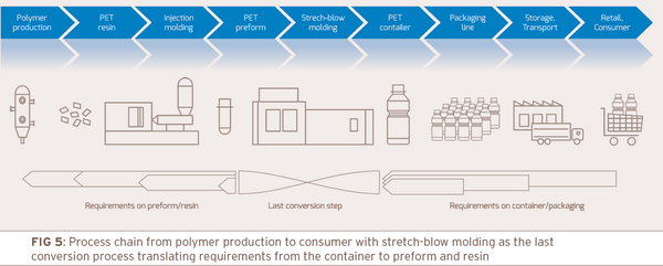 From a manufacturing perspective the stretch-blow molding step as the last conversion step, where the PET container first takes shape, plays a central part. It translates between the requirements for further production and functioning of the package and the requirements on the upstream processes of resin and preform production.