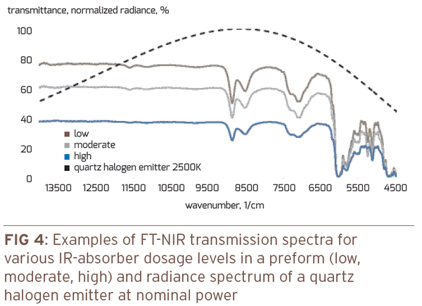 The heating process parameters on the stretch-blow molder will be heavily dependent on the preforms absorption characteristics because of the distinct overlap of affected spectral transmission range and emitter radiance (Figure 4). Consequently, changes upon switching to a new batch of preforms or fluctuations within a batch are undesirable.