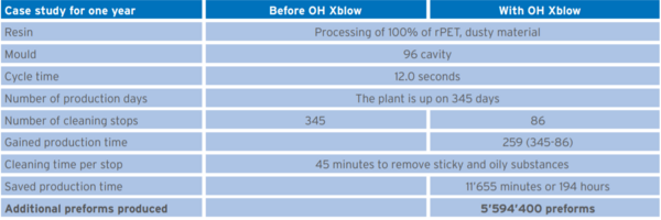 With OH Xblow installed, up to four cleaning cycles can be skipped before the next manual cleaning stop. As a result of this, the production runs are now five times longer, compared to before installation of OH Xblow. The first customer - consequently - upgraded all his cold sides for long runner preforms with OH Xblow.