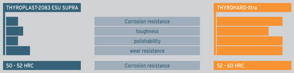 Modern plastic mould steels, such as THYROPLAST 1.2294 and THYROHARDXtra, are specifically designed for longterm use. They offer an exceptional combination of properties that are perfectly tailored to the challenging requirements of plastic injection moulding: