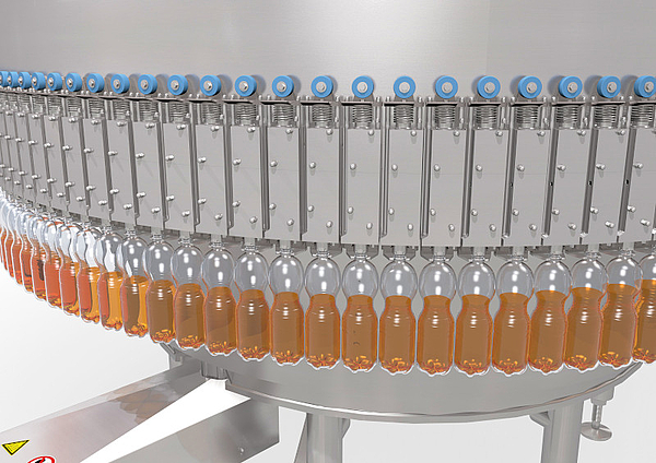 The exact filling volume is determined with the help of an inductive flow meter or – optionally – a mass flow meter. Two different filling speeds are configured as standard that ensure optimum flow behavior and low-foam filling. A number of optional additional components are available for the best possible processing of different volumes and viscosities, such as a large spectrum of bottle sizes or juices with a low or high viscosity. A control valve upstream of the filling valve can freely regulate the filling speed for production within a capacity range ideally suited to the type of beverage, amount of foaming, bottle volume and viscosity. Together with extremely gentle container control, this results in less product loss.