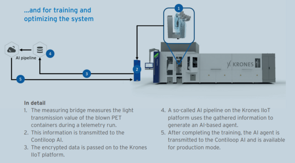 Because production conditions are constantly changing, it’s not enough for Krones to have the controls revert to a specific, pre-set formula. Instead, various initial process settings are made for the system in an automated trial run and the resulting measurements are passed on to the Krones IIoT (Industrial Internet of Things) platform. There, the data flows into the Krones AI pipeline and is used to train the rule algorithm, the “intelligent agent”. When training is complete, the agent is loaded onto the machine’s Contiloop AI and is then available for use in production operations.