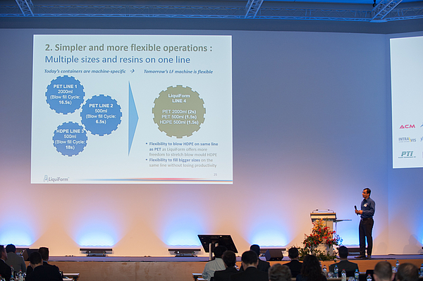 “We are seeing broad interest in the LiquiFormTM process which we first presented in detail at last year’s PETnology,” beams Ann O‘Hara. And she is expecting the first commercial machine to be installed in another year’s time. The main advantages of the new process is the simplicity and the associated reduced footprint, thanks to the fact that just one machine is needed instead of three (air compressor, stretch-blow moulding machine and filling line), and importantly, the resulting energy consumption and other elements of cost savings also associated with the simplicity of one machine not three.