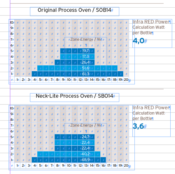 The production examples shown in Fig. 4 demonstrate the energetic advantage of a Neck-Lite preform over the standard execution in the case of a 0.5l bottle weighing 10.5g. Here, the benefit of the Neck-Lite preform is a weight saving of 0.25g, i.e. of approx. 2% of the total weight. A pleasant effect was also that, thanks to the thinner wall in the neck area, the heater setting in the IR oven could be reduced from 4.0W to 3.6W per bottle. The energy saving in this case amounts to 10% in total.