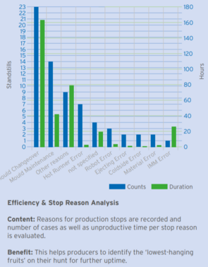 Customer value is created in several ways, for example when maintenance becomes predictable: True cost associated with dealing of unplanned production interruptions and production losses sum up quickly. OH Xport features packages that assist plant managers and machine operators with planning of appropriate corrective action. OH Xport is available as an entry version including mould shot counter, efficiency evaluation, stop reason evaluation. It can be spiced with additional packages. Selected packages are explained with pictures 3 to 6.