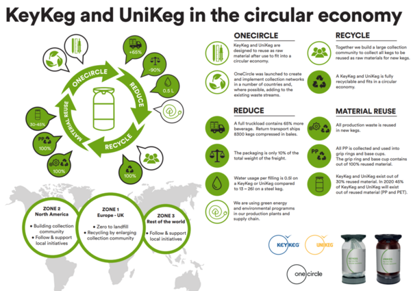 One Circle's activities are continuous work in progress, and we are committed to taking responsibility for the end of life of our kegs, KeyKeg and UniKeg, and to connect with relevant businesses to create a circular economy. The infographic shows you how our kegs fit in a circular economy.