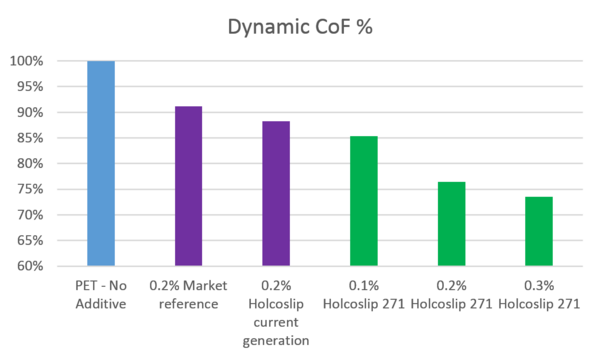 The results show that all candidates have an improved COF vs the PET sample without additive. However, Holcoslip 271-series already presents better slip performance at half the dosing level vs alternatives. Next to this typically at least 10% more preforms can be stored into an octabin compared to those containing no additive, reducing storage and transportation costs. The new generation slip additive can also be used at a considerably lower dosing level, typically to 50% lower, to reach the same effect as competitive solutions in the market. Furthermore, Holcoslip 271-Series is compatible with most liquid additive / colorant dosing systems.