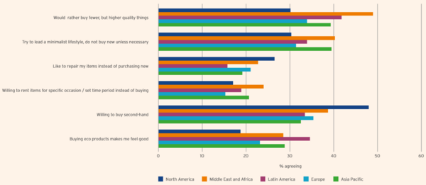 Eco-anxiety is creating greener expectations. Interest in sustainable products peaks after the age of 30, in line with increased disposable income and earning potential. This interest is also usually higher among consumers with children. However, there is no onesize-fits-all solution. Understanding which solution works best in specific markets and consumer types is essential for companies with strong sustainability commitments. While consumers in the Middle East and Africa and Latin America prefer to buy longer-lasting products, the minimalist movement is strong in Asia and second-hand products are becoming attractive in Western markets, such as the US and Europe.