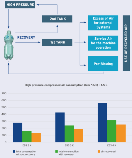 Fig 6: Compressed air recovery system: examples of application on EBS K ERGON models 1.5 L bottles / 2250 bph-cavity / 33 bars