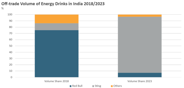 In 2017, PepsiCo entered with Sting energy drink, priced at INR50 per 250ml can, while Red Bull, the leading player, charged nearly double that for the same quantity. Realising the need for affordability to attract a broader consumer base and mine untapped potential in the category, particularly in rural areas, PepsiCo acted. In 2020, it introduced Sting in a 250ml PET bottle priced at INR20, focusing on accessibility. Coca-Cola followed suit in 2022, launching Thums Up Charged Berry Bolt, now changed to Charged, leveraging the strength of its established Thums Up carbonates brand. Both companies benefit from their extensive distribution networks, allowing them to reach consumers in urban and rural areas.