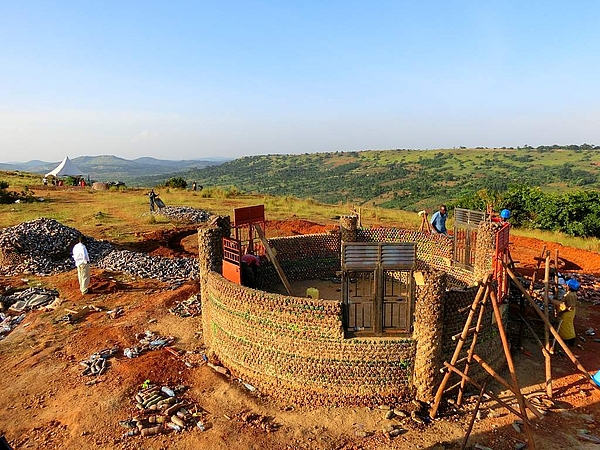 One of the projects carried out by SINA to teach their scholars to think beyond the conventional concerns the building of bottle houses. Yes, houses made out of bottles. They take ordinary plastic bottles, fill them with clay, compress them and tie them together. The gaps in between the bottles are then filled with mortar. Once painted, water bottle houses look just like conventional brick houses. Amazingly enough, bottle houses are also earthquake-resistant and they buffer heat.