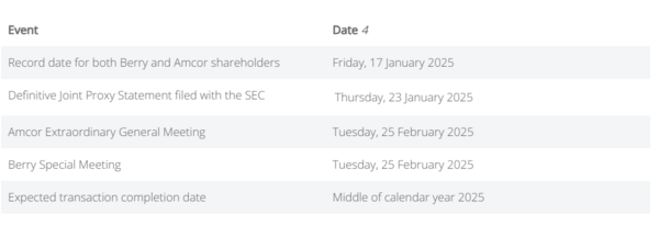 Amcor and Berry Global announce that an important milestone towards the completion of their previously announced all-stock transaction has been reached, with filing of the definitive joint proxy statement with the U.S. SEC. The Joint Proxy Statement includes notices of Amcor and Berry shareholder meetings that will both take place on Tuesday 25 February, 2025.