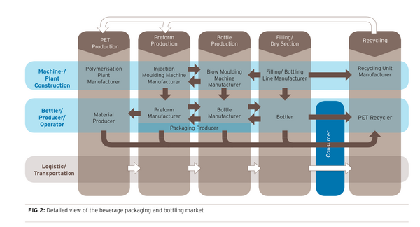 Looking at the value-added chain in the production and filling of a PET bottle, it soon becomes clear that market participants are not just trying to come up with new innovations in order to assert their position, but are also expanding their activities in the neighbouring elements of the value-added chain (FIG. 2). This process set in a few years ago, leading to the formation of larger companies and thus to concentration and a market limit.