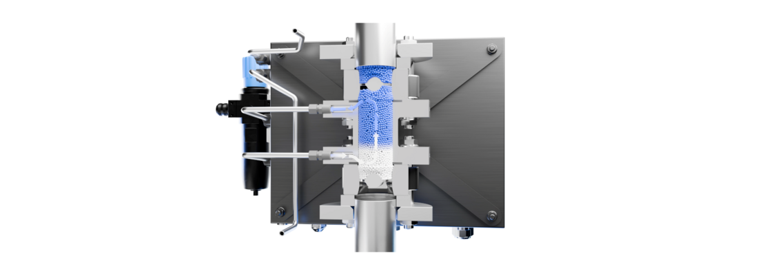 The DewTector uses a straightforward approach ─ it introduces a partial flow of bulk solids into a pressure-tight product chamber. The system determines the moisture content by analyzing the moisture released into the airflow. As the air absorbs moisture, it is analyzed by a hygrometer that measures only water content. This targeted detection ensures reliable results unaffected by other substances or changes in material composition. The system neither requires extensive calibration, nor the use of chemicals for different materials or recipes, making it easy to operate and maintain. The system achieves an accuracy of +5% to −15% across moisture levels ranging from several thousand ppm to a few hundred ppm, with up to ten measurements per hour.