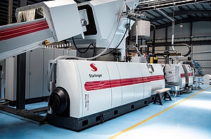 The shredded and washed LDPE and HDPE packaging waste is processed on a recoSTAR dynamic 145 C-VAC delivered by Austrian manufacturer Starlinger recycling technology. The line produces approximately one metric ton of regranulate per hour – a capacity frequently requested by film recyclers – and thereby offers PCC an economically attractive solution with an optimal cost-benefit ratio. Thanks to the tried-and-tested combination of highly efficient C-VAC degassing module and continuous melt filter, the recycling line skilfully masters residual contamination and highly printed material as well as a certain residual moisture that the film typically shows after the washing process.