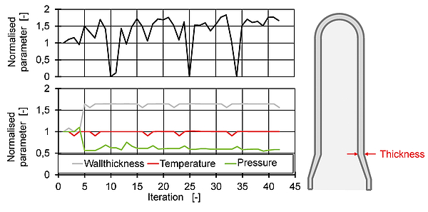 Fig. 7: Optimization for maximum topload with variation of the preform wall thickness and corresponding process parameters