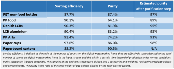 Sorting efficiency and purity were measured across the different material fractions, achieving the following sorting efficiency and purity results: