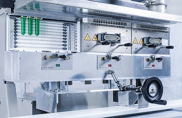 KHS has used the energy-efficient preferential heating method on its InnoPET Blomax stretch blow molder series since 1997. The preform is first heated in the standard heater where the container constantly rotates to ensure that it is evenly heated. This rotation is deliberately interrupted in the downstream preferential heating module so that only certain areas of the PET preform continue to be actively heated from two sides. The distance of the preforms to one another is kept as small as possible, thus significantly lowering the machine’s energy consumption. This is also assisted by KHS’ highly efficient NIR heating system. The precise alignment of the heating profile also yields a higher quality.