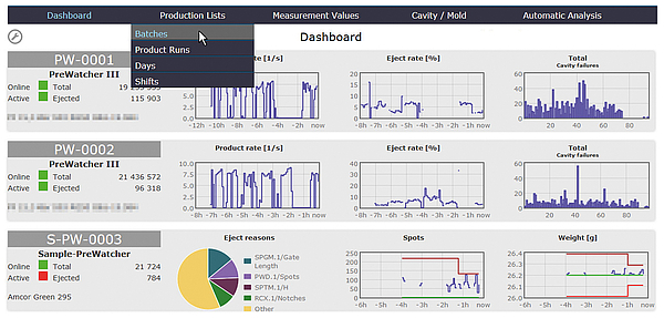 The IntraVisualizer receives all needed data of several systems in one production facility from the server that collects it. When the software accesses the data base, it can visualize different time periods like shifts, days, free date ranges and also batches. The user receives instant answers to his questions: What is the production rate, what are the cavity faults and what are the main reasons for ejections?