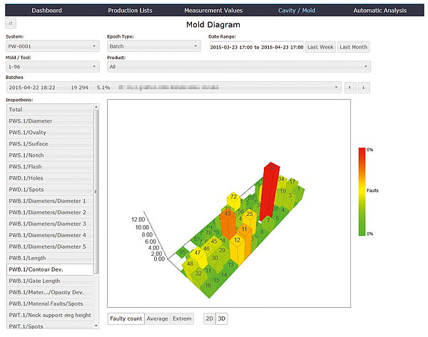 The IntraVisualizer is also able to generate mold diagrams to let the operator observe the error rate of the cavity and single molds. To do so, the user can choose a product, time period, product run and molds on the interface and hereinafter within seconds receive a diagram about which production molds deliver a reliable performance. It shows the entire cavity or single molds, as a 2D or even 3D diagram, including the statistics of the total number of objects, incomplete evaluation and faulty objects.