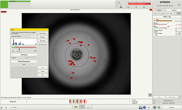 To save operators from diving into the reject bin extensive statistics came to human-machine-interfaces of the vision inspection systems. They tell machine operators which defects occur how often and when. Beside bare columns of figures, easy-to-read diagrams give information how the reject rate has developed over the last time, how the variance of different object dimensions look like or what the most prominent defect is.