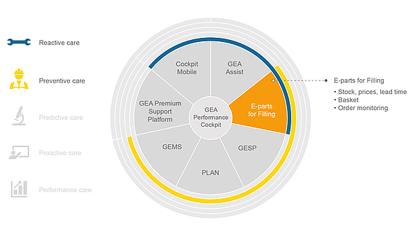 Using GEA eParts for Filling ordering platform customers can order original spare parts 24/7, and access real-time information on prices, stock, lead times, and part availability. The search modules are based on interactive spare parts manuals, making it easy to find any item of demand. Service kits, which bundle parts for specific machine groups, are also available here. This reduces repair costs and staff downtime due to unplanned system outages and improves the reliability and availability of GEA filling and packaging lines.
