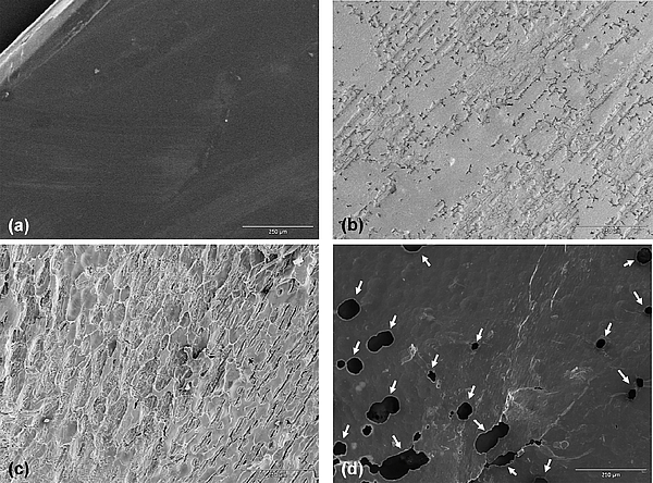 Fig. 2: Scanning electron microscopy images of low crystalline PET films degraded by a polyester hydrolase. (a) Untreated PET, (b) with 10.4% weight loss, (c) with 29.2% weight loss, and (d) with 97.5% weight loss. Arrows indicate holes in the PET film (R. Wei, Leipzig University).
