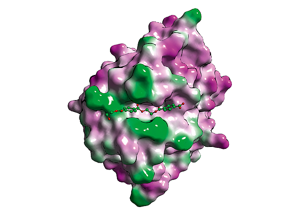 Fig. 1: Surface of a polyester hydrolase with a PET model compound docked within the substrate groove. Green, carbon atoms; red, oxygen atoms; green and pink surface, lipophilic and hydrophilic surface patches, respectively. The enzyme catalyses the hydrolysis of ester bonds in the PET polymer (R. Wei, Leipzig University).