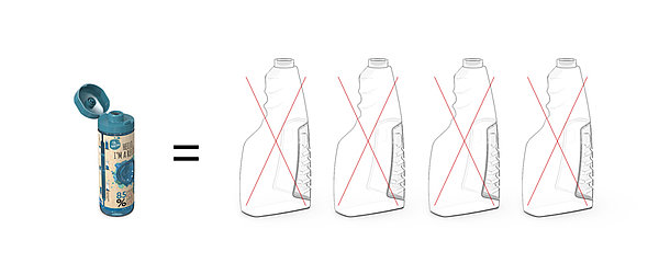The newly developed 200-milliliter refill bottle is made of HDPE, PP, or PET material and weighs just around 16 grams in its original form. It contains 200 ml of concentrate, which later produces ten times its liquid volume across four spray bottle refills. Each safe, 50 ml dose can also be adjusted to 30 ml or 40 ml. This is done through a special valve and a guiding nozzle that fits into all standard spray bottles. Thanks to their shape, the new refill bottles make it easy for consumers to squeeze out their contents in consistent doses – plus, they can be provided with an attractive label. In addition, the nonremovable, hinged snap-on lid is fitted with a safety lock. And a user-friendly level indicator completes the list of practical features. As a result, the newly designed bottle is well placed to meet all current market requirements.