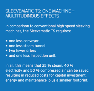 In order to meet all expectations for sleeving technology, Krones has developed the Sleevematic TS. TS stands here for Top Speed, since Krones’ technology enables a high output of up to 50,000 containers per hour to be reached with just a single station.