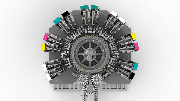 In terms of the colour space, the development people at Krones opted for the CMYK model, which creates the different hues by printing the four components Cyan, Magenta, Yellow and Black (Key) on the same surface in different combinations. As a widely used printing standard, the CMYK model already covers a very broad spectrum of colours. If a client wishes to have corporate or brand colours above and beyond these, he can alternatively also use special inks. The associated printing heads operate using the non-contact drop-on-demand principle, where each drop of ink is not created until immediately before it is actually used.