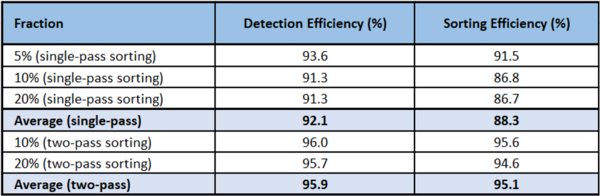 Detection efficiency was 92.1%, while sorting efficiency was 88.3%, on average. For two-pass sorting, the detection and sorting efficiencies were 95.9% and 95.1% respectively.