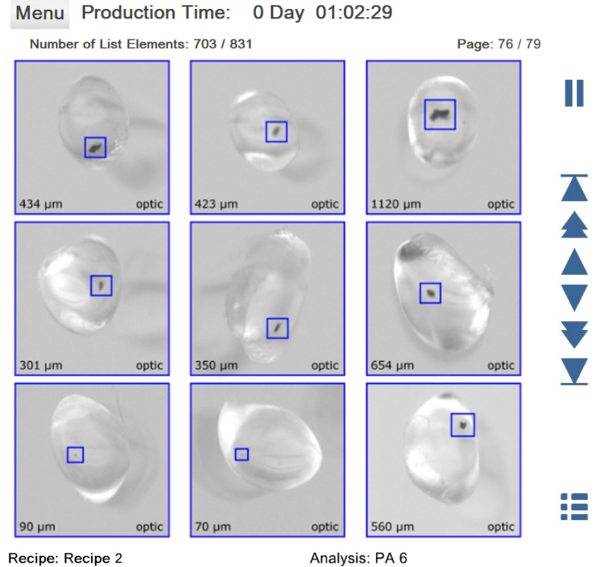 Smallest process variations in compounding plants can already cause changes in the technical and optical characteristics of the pellets and in further processing to the future product. Thermal and mechanic overloads of the polymer, contamination caused by the production environment or a work overload of the staff can result unnoticed in contaminated pellets in the form of black specks, yellowing, burns, metal, dust etc.