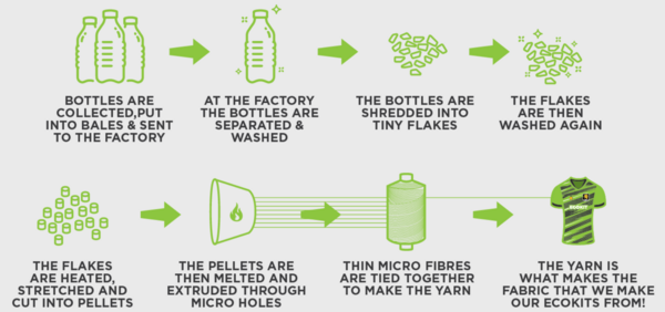 Every shirt is manufactured using a piece of fabric made from the equivalent of approximately 16 plastic bottles. The EcoKit material behaves in the same way as virgin polyester would, which means no difference in performance from standard kits.
